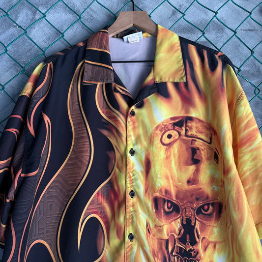 Camisa de botones vintage Universal Studios Hombre Talla L Negro Rojo Terminator Flamas Y2K